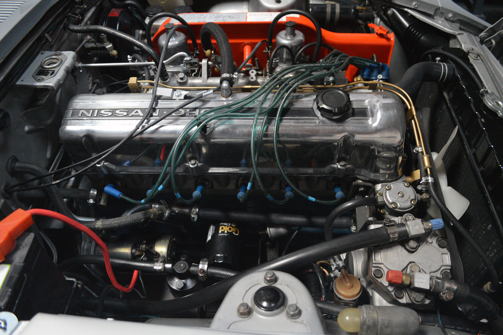 Lot #563 - This 240Z features a rebuilt 2.4-liter 6-cylinder engine that is topped by the rebuilt original Hitachi round-top carburetors. The engine is mated to a 4-speed manual transmission. The air cleaner assembly has been restored, air conditioning has been serviced and the valves have been adjusted. The silver exterior paint was wet-buffed and sanded. The hood and other exterior areas had a recent paint touch-up. The front and rear bumpers were rechromed. The black interior has a new armrest. New center caps were installed on the wheels.